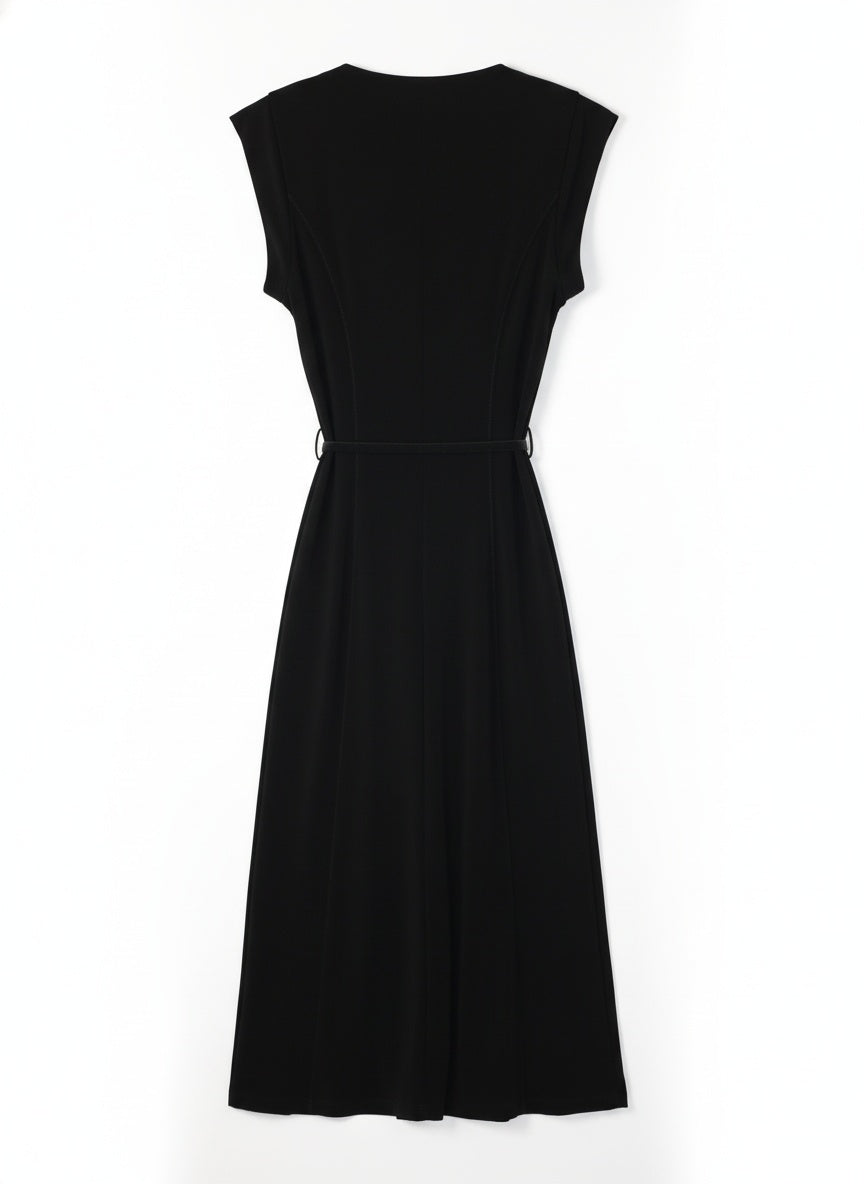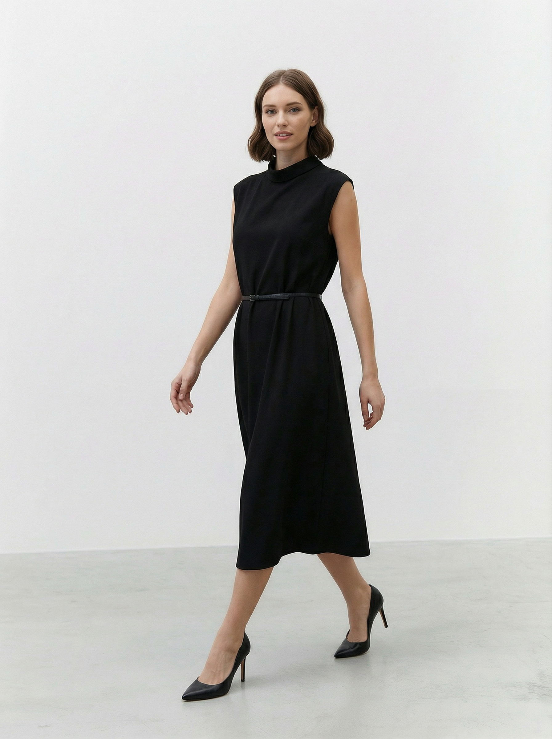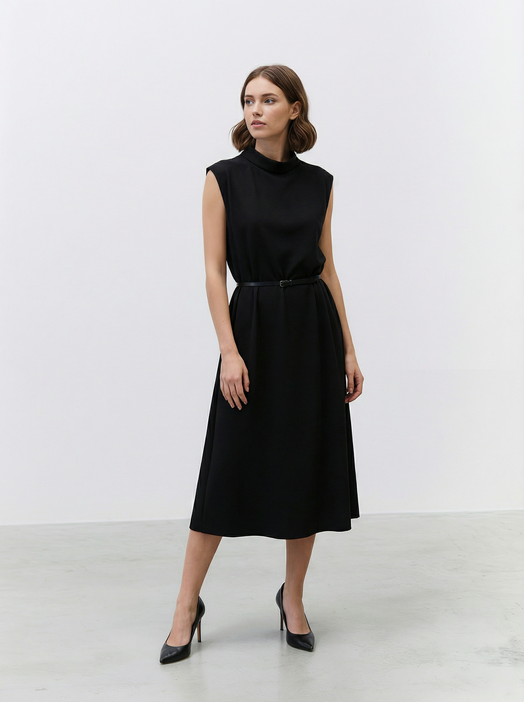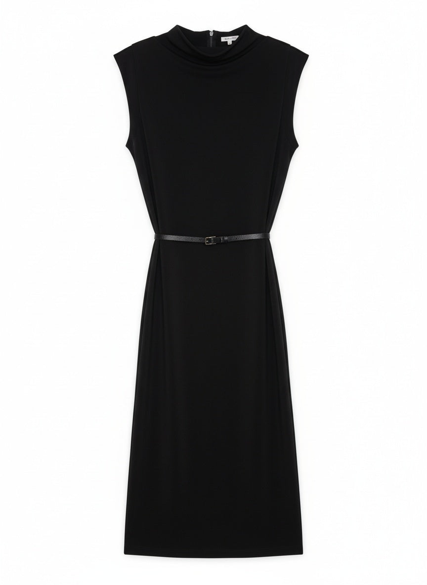Abito midi Atos Lombardini con cinturino sottile in vita e linea essenziale dal taglio contemporaneo. Il design smanicato e il collo alto creano un’eleganza minimal e raffinata, perfetta per ogni occasione. Realizzato in tessuto tecnico fluido con una leggera componente elastica, offre comfort e una vestibilità impeccabile.