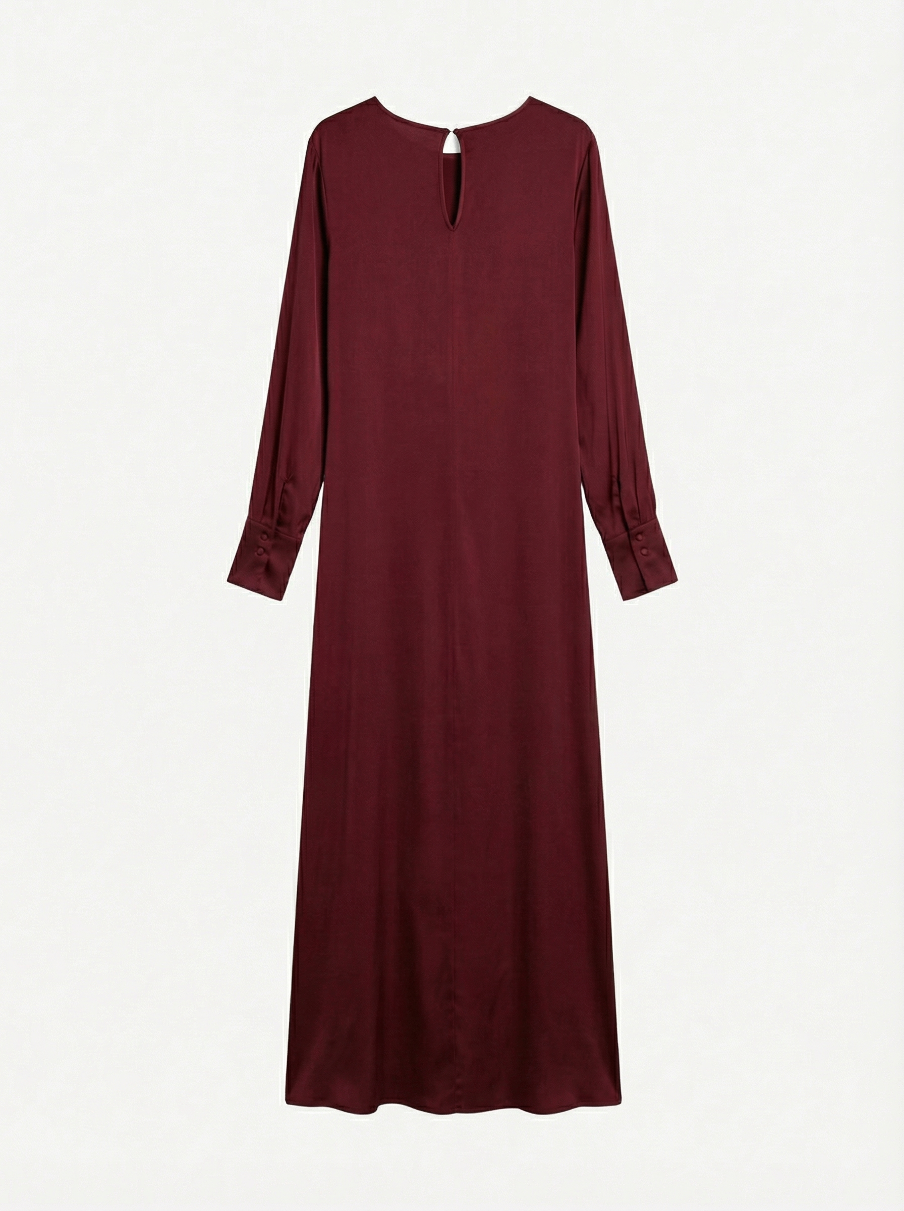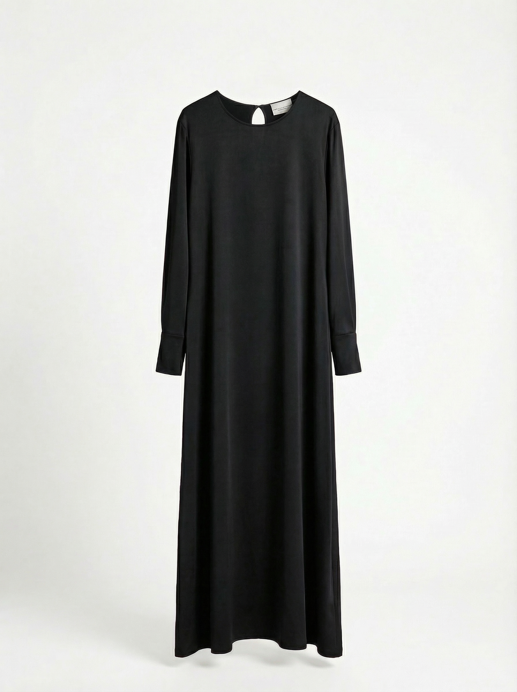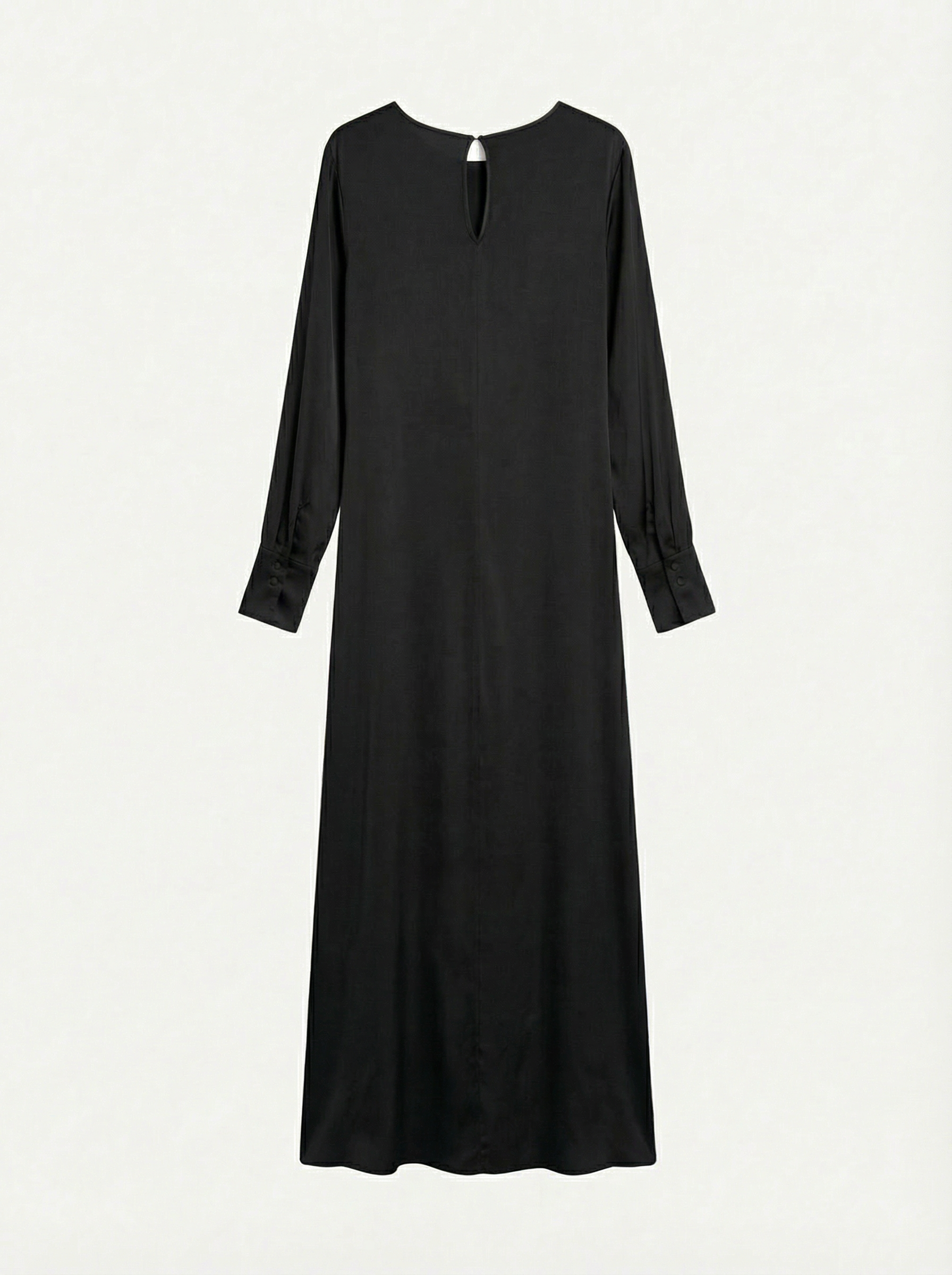 Abito midi Atos Lombardini in tessuto lucente con polso camicia e linea essenziale dal fascino raffinato. Le maniche lunghe con polsini strutturati e lo scollo rotondo con apertura a goccia posteriore donano equilibrio tra eleganza classica e modernità. Perfetto per eventi serali o occasioni speciali, grazie alla fluidità del tessuto che accompagna naturalmente le forme.