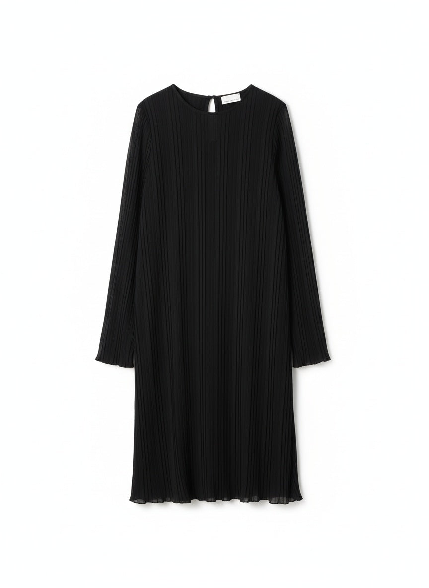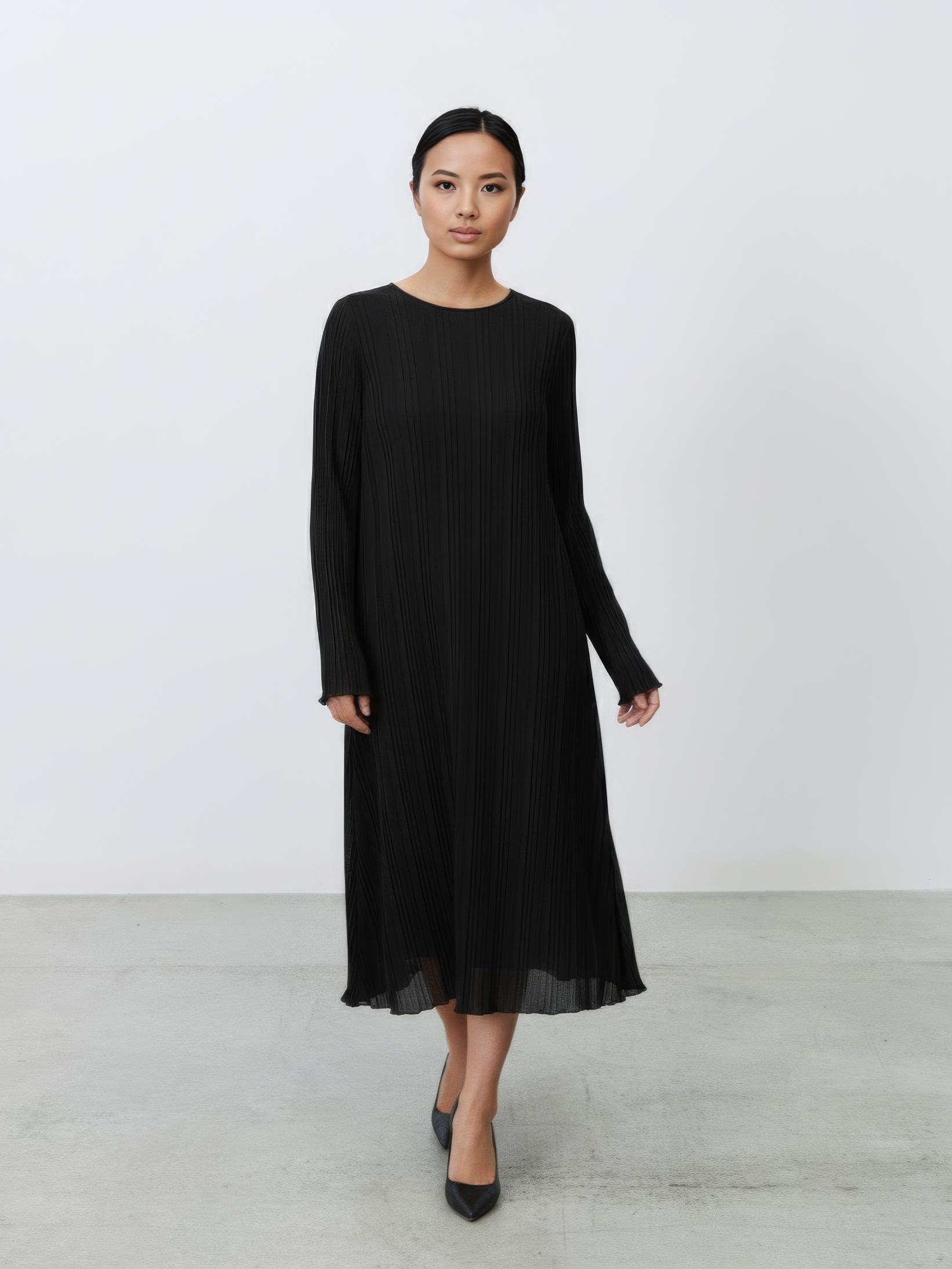 Abito midi plissé firmato Atos Lombardini, con maniche lunghe e scollo rotondo. La lavorazione plissettata dona movimento e leggerezza al capo, creando un effetto fluido e sofisticato. Il design minimal e la linea dritta lo rendono perfetto per look eleganti ma disinvolti, da interpretare con accessori diversi a seconda dell’occasione.