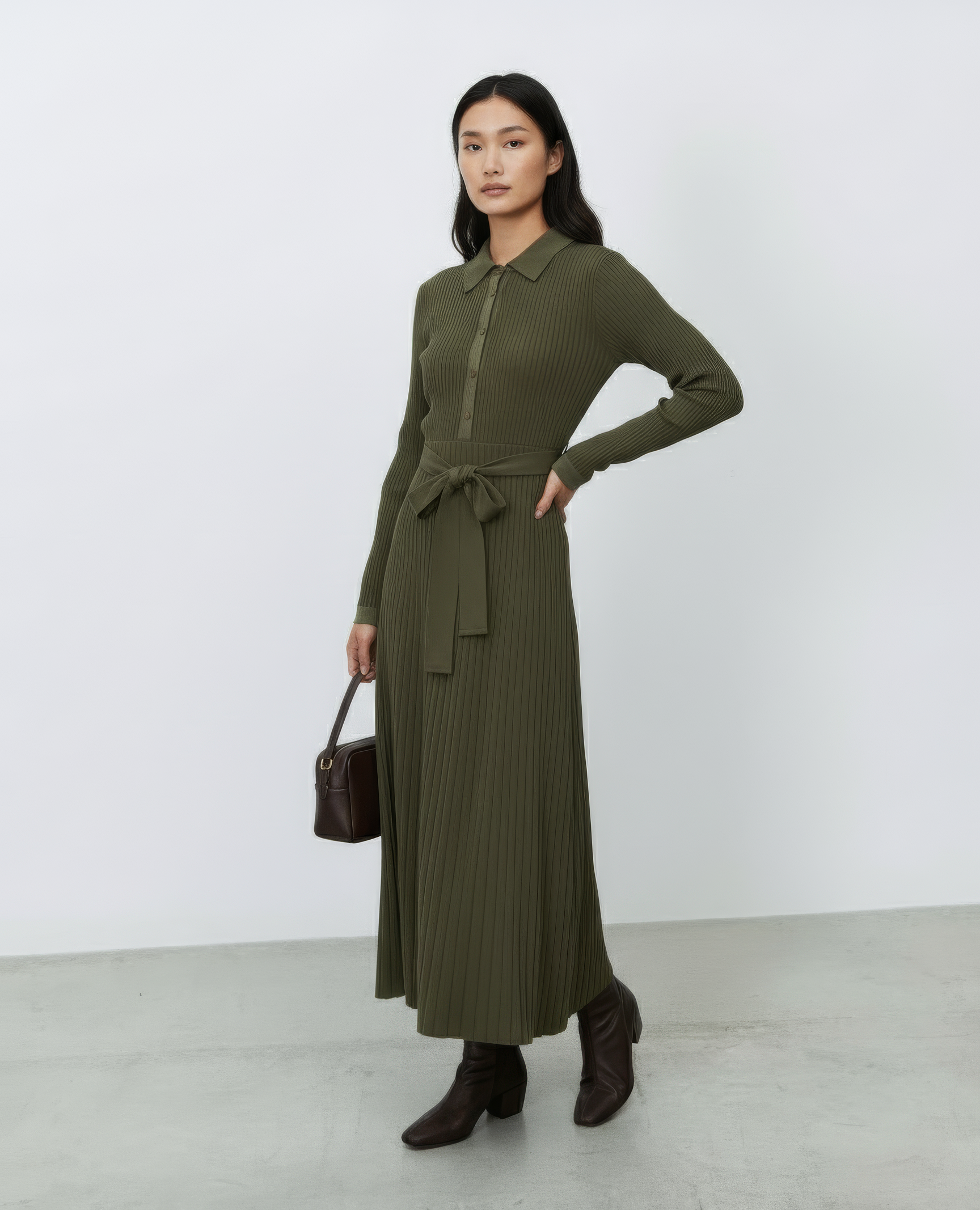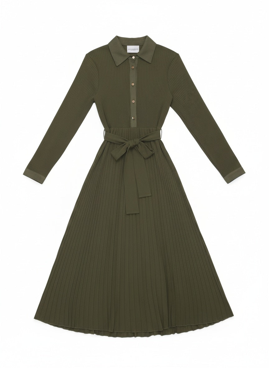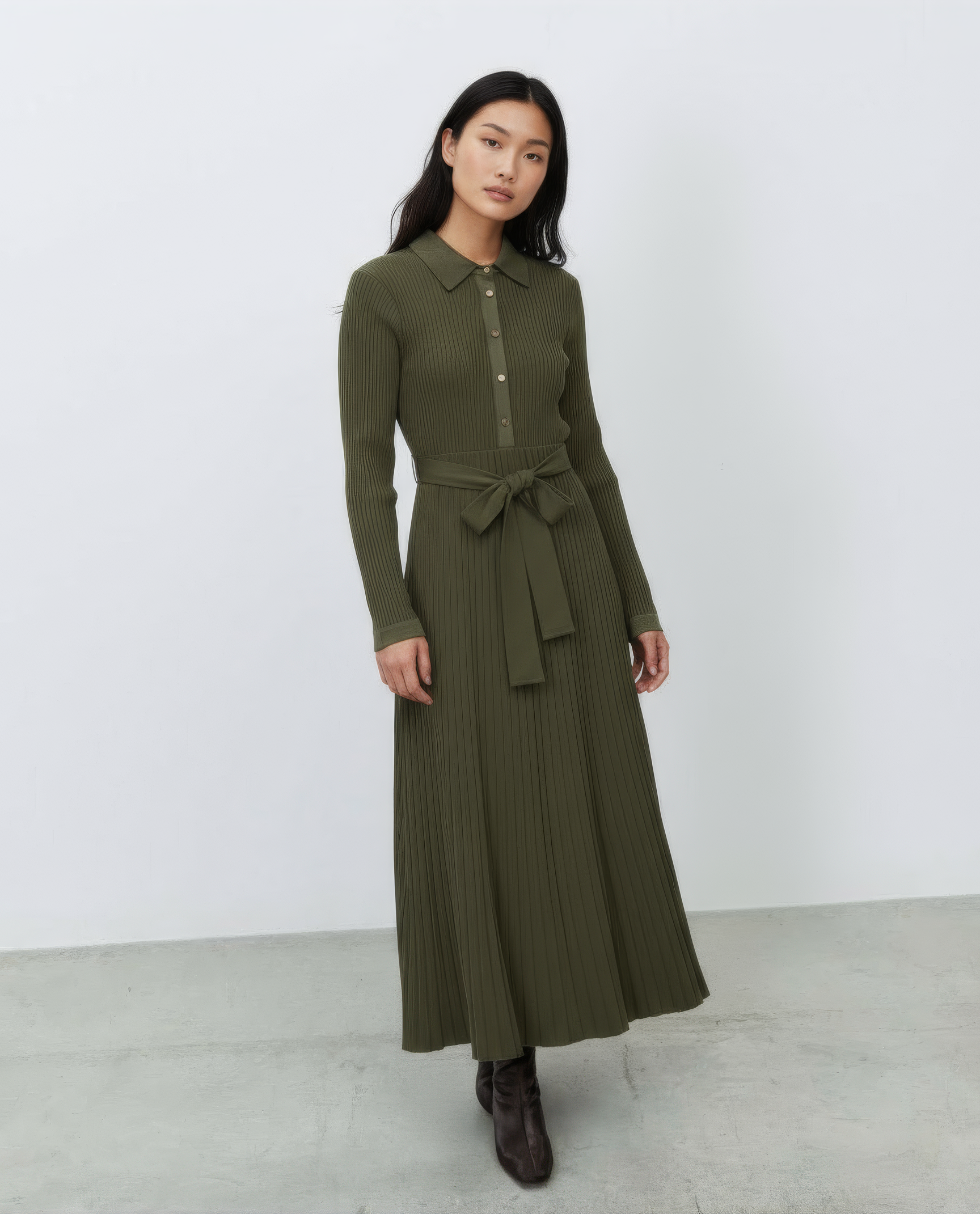 Abito plissé chemisier firmato Atos Lombardini, caratterizzato da colletto classico, chiusura frontale con bottoni e cintura coordinata in vita. Il design plissettato dona movimento e femminilità, mentre la silhouette lunga e fluida crea un’eleganza raffinata e senza tempo. Un capo versatile perfetto per il giorno e per la sera.