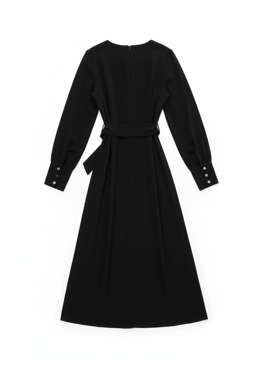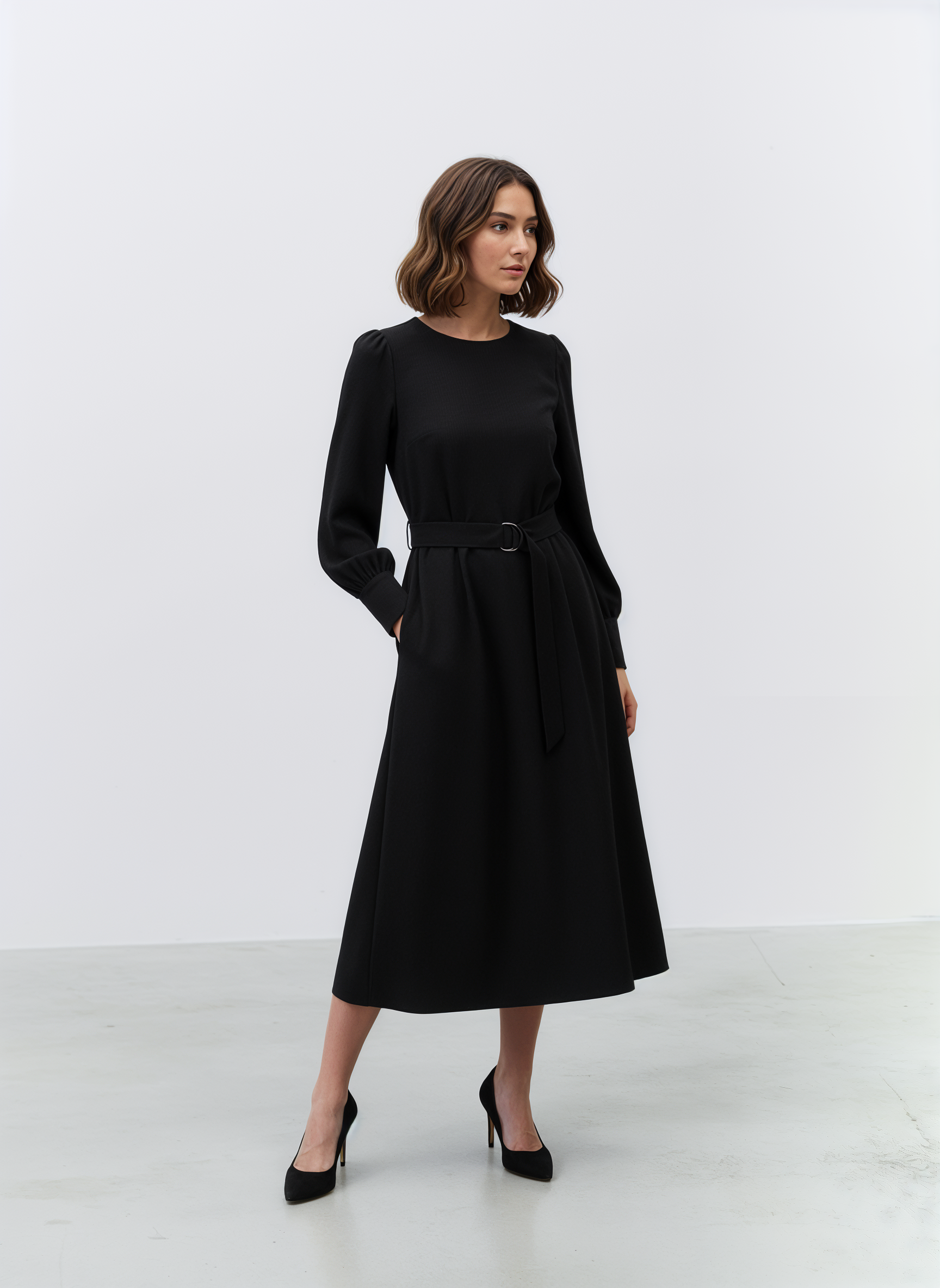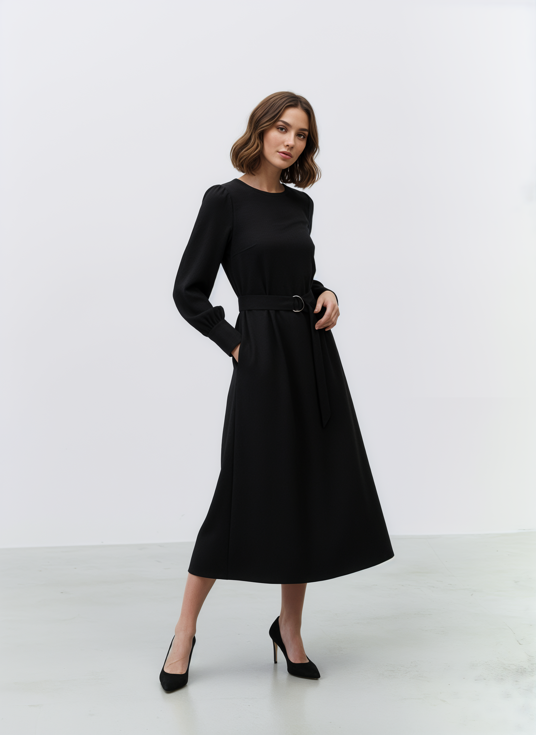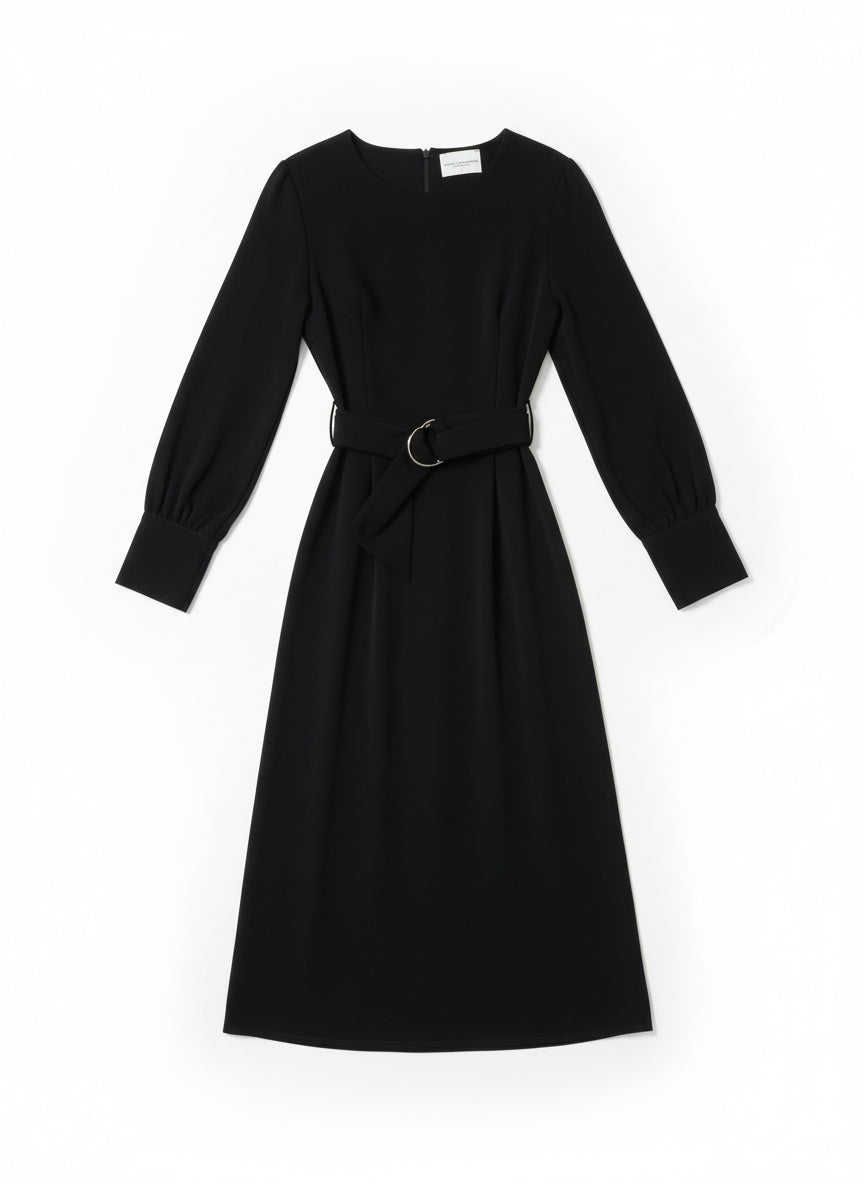 Abito svasato firmato Atos Lombardini, con linea midi e cintura coordinata in vita. Le maniche lunghe e lo scollo rotondo creano un’eleganza sobria e femminile, mentre la struttura del tessuto valorizza la silhouette senza costringerla. Un capo essenziale e versatile, perfetto per look quotidiani o occasioni speciali in chiave raffinata.