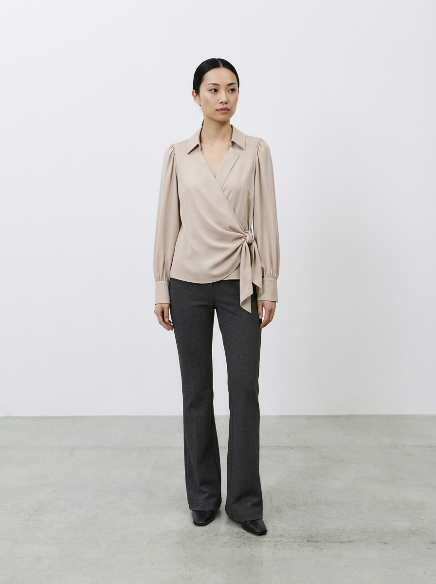 Una camicia dal twist elegante, definita dal caratteristico nodo laterale che valorizza la silhouette con naturalezza. Il design fluido e la linea pulita rispecchiano l’estetica sofisticata di Atos Lombardini, perfetta per completare look sia quotidiani che più formali.