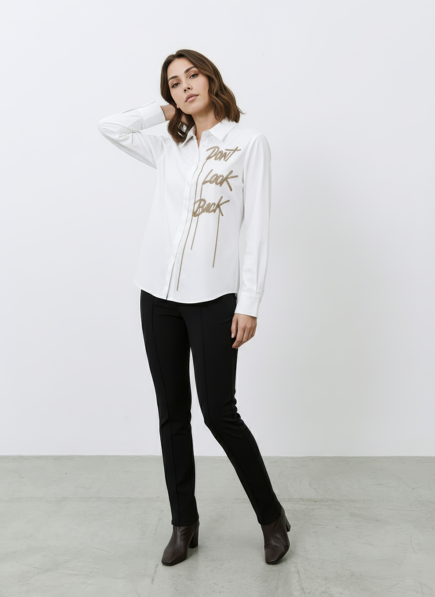 Camicia DON’T LOOK BACK firmata Atos Lombardini: un classico bianco rivisitato con un dettaglio ricamato che cattura subito l’attenzione. Perfetta per dare carattere a look essenziali e per aggiungere un tocco deciso a qualsiasi outfit, senza perdere l’eleganza che contraddistingue il brand.