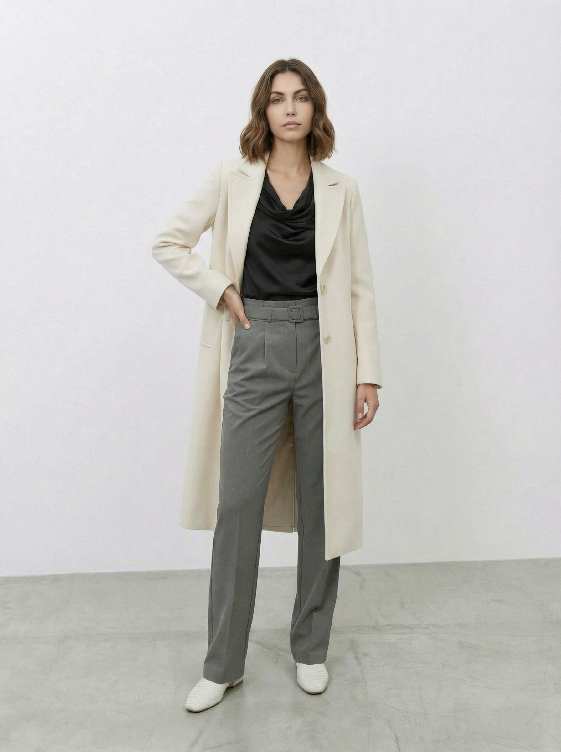 Questo cappotto monopetto unisce una linea pulita e moderna a un’attitude senza tempo. Il design minimal valorizza la silhouette, mentre il singolo bottone frontale aggiunge carattere e raffinatezza senza appesantire l’insieme. Perfetto per la città, per l’ufficio o per un look serale ricercato, è un capo passe-partout che dona subito un’aura sofisticata.