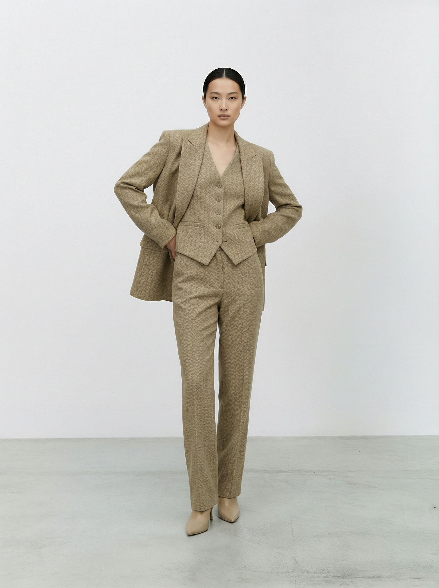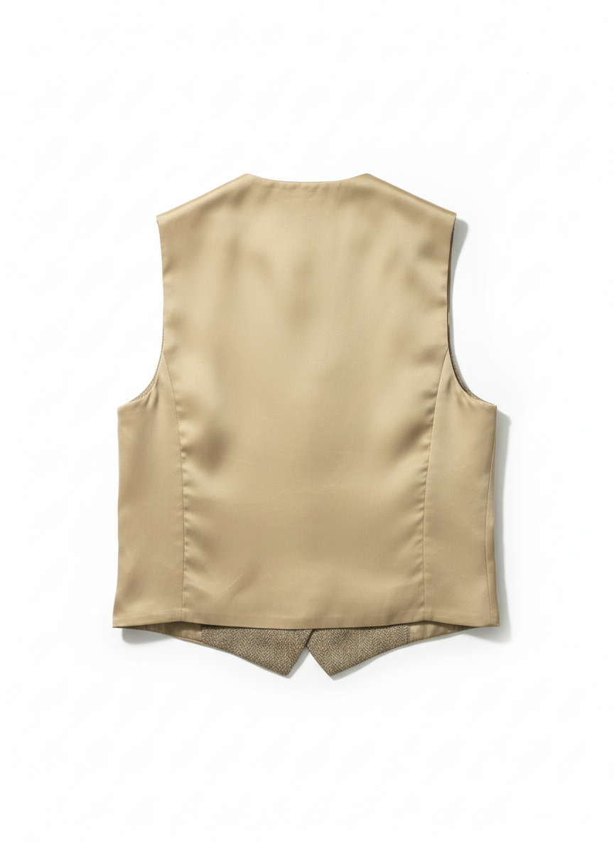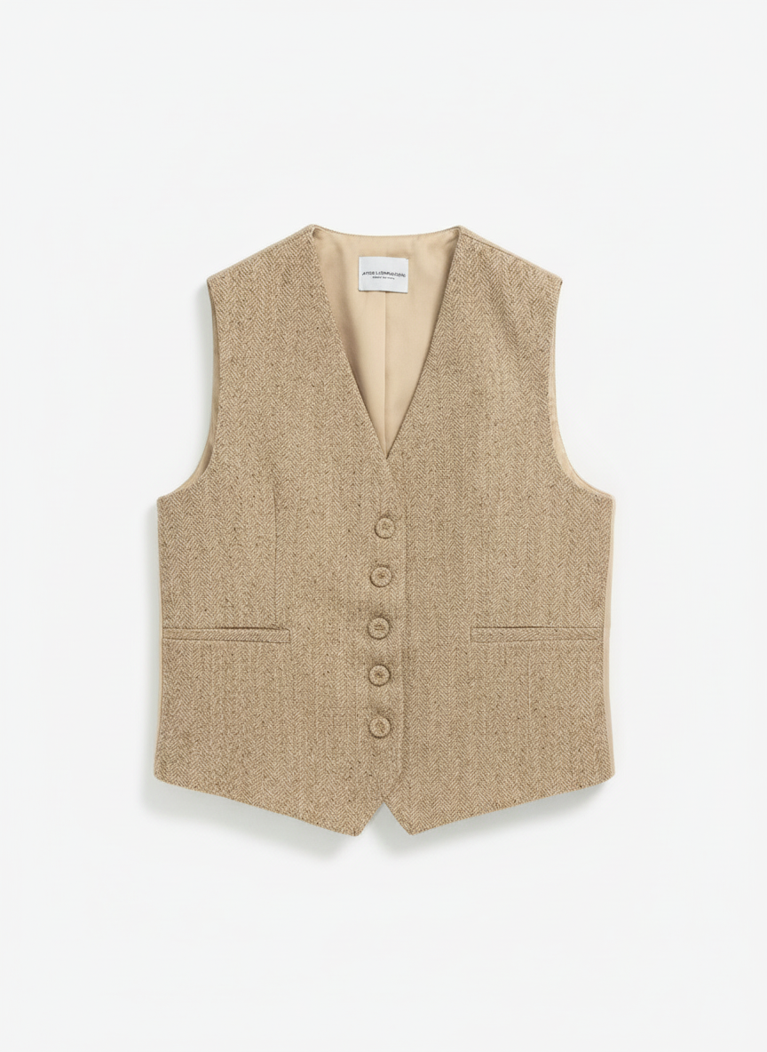 Gilet spigato dal fascino classico, costruito con linee pulite e una texture raffinata che valorizza la silhouette. La lavorazione a spina di pesce aggiunge profondità al design, mentre il retro liscio e la fodera interna completano il capo con una nota di equilibrio e luminosità. Un elemento chiave per completare il completo con la sua eleganza misurata e intramontabile.