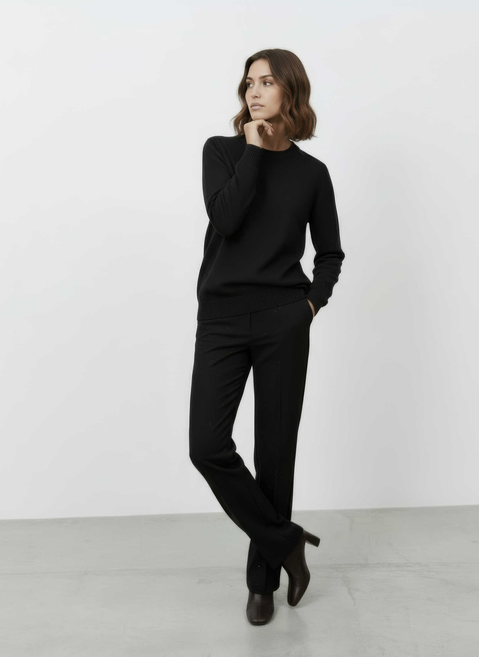 Maglia girocollo in misto lana Una maglia essenziale, morbida e versatile, pensata per accompagnare ogni look con discrezione e comfort. La lavorazione fine e il taglio pulito valorizzano la silhouette senza rinunciare alla praticità, rendendola perfetta per l’uso quotidiano o per completare outfit più raffinati.