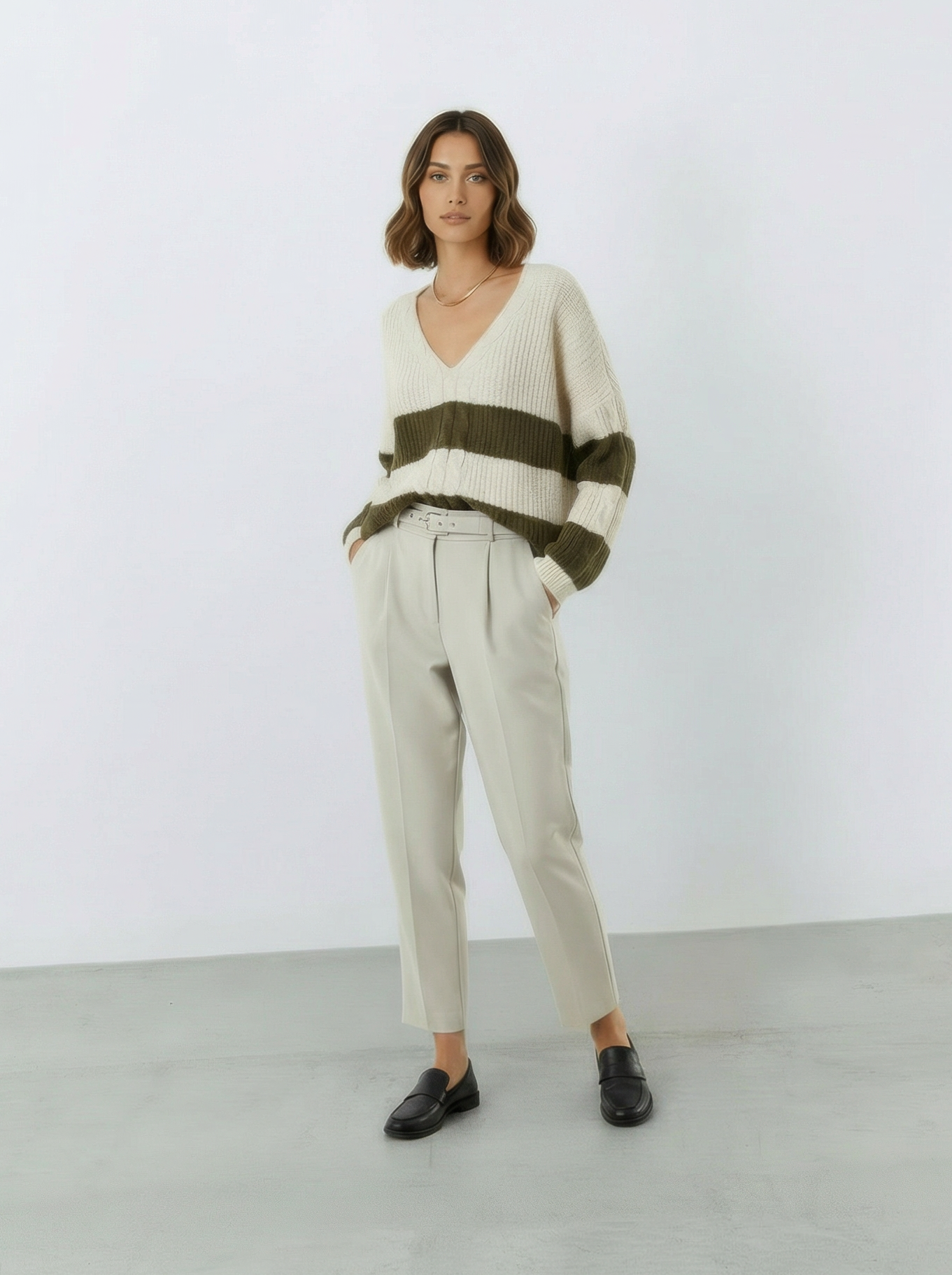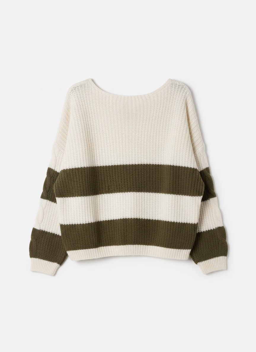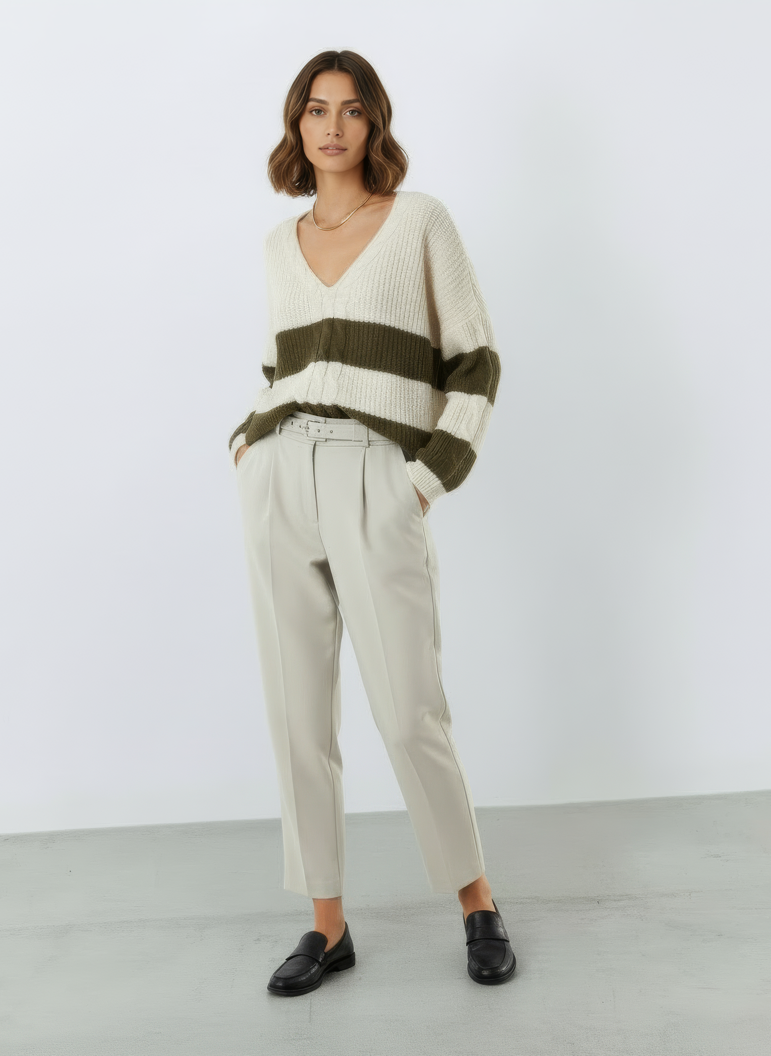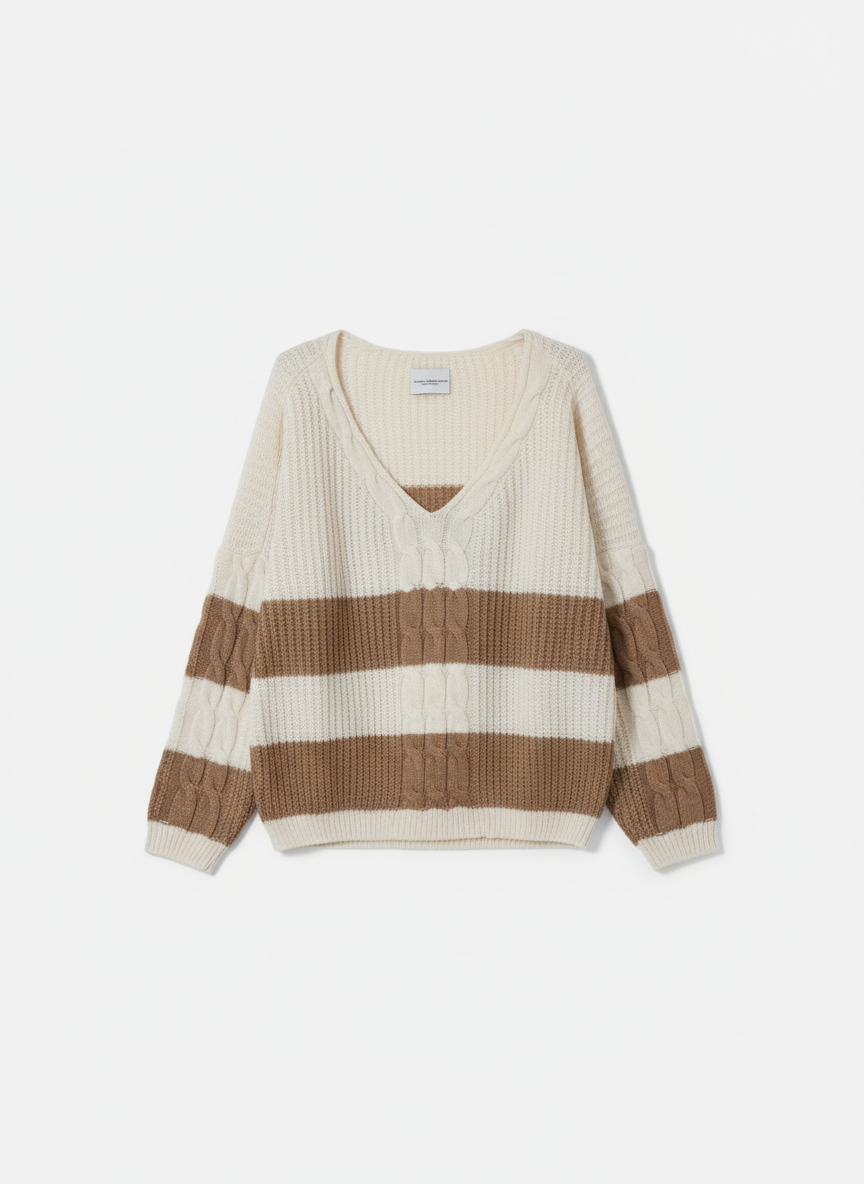 Pullover a righe dal fascino morbido e avvolgente, perfetto per chi ama un’estetica calda e senza tempo. Le fasce a contrasto e la lavorazione a trecce ne esaltano il carattere, creando un equilibrio ideale tra comfort e stile contemporaneo. Un capo che si inserisce con naturalezza nell’universo di Atos Lombardini.