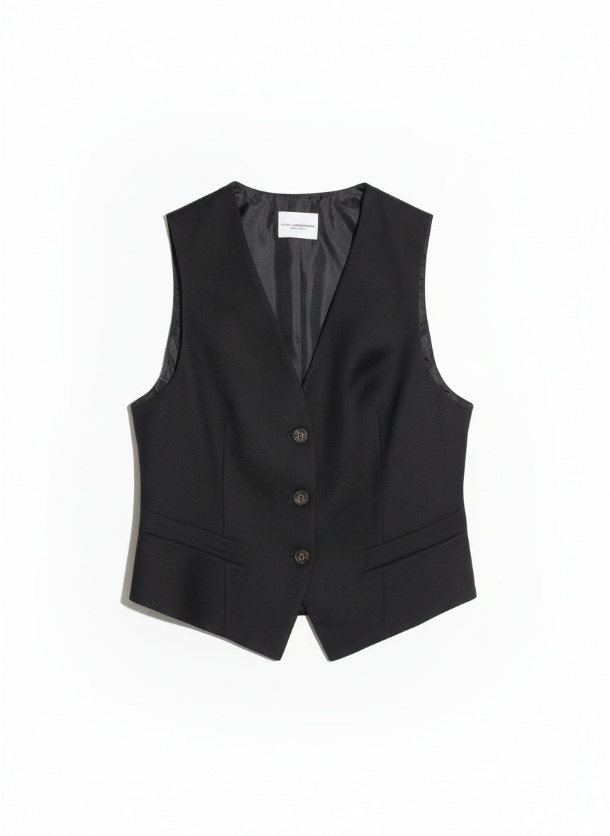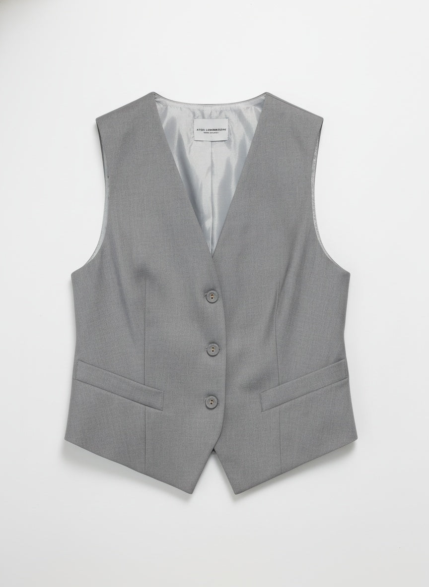 Tailleur Atos Lombardini composto da giacca monopetto, gilet coordinato e pantalone a vita alta con pince. Realizzato in tessuto tecnico fluido e leggermente elasticizzato, offre una vestibilità impeccabile e una silhouette dal taglio maschile ma raffinato. Un completo elegante e contemporaneo, ideale per il lavoro o per occasioni formali.